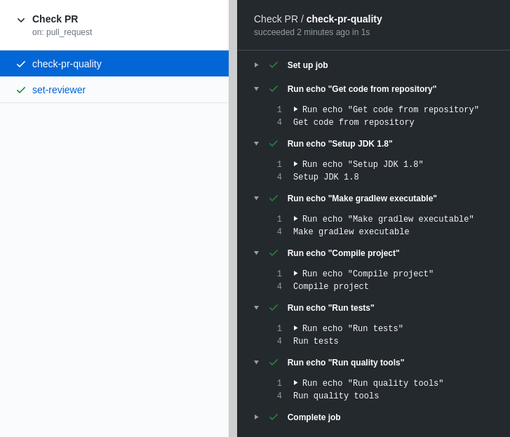 - The first job, named check-pr-quality, has 6 steps and in each one runs the echo command to print a message.