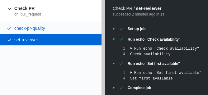 - The second job, named set-reviewer, has 2 steps and, as in the first one, it runs the echo command in each step to print a message.
