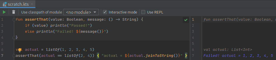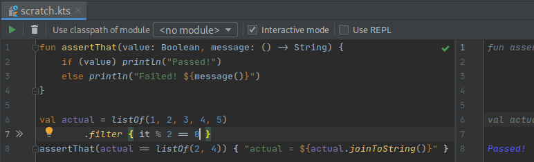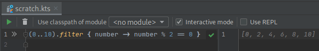 But the most powerful aspect of those files is when you create code related ones. If, for example, you create a scratch.kts file and start writing some Kotlin in it, you will see your code being run on the fly presenting to you its result: