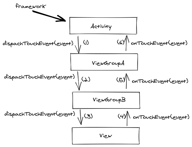 So, when the framework registers a motion event it sends it to our activity which then calls the dispatchTouchEvent method in its root view. The root view dispatches the event to its child view that was in the touch area, the child view to its child and so on so forth until the event reaches the last view in the hierarchy: